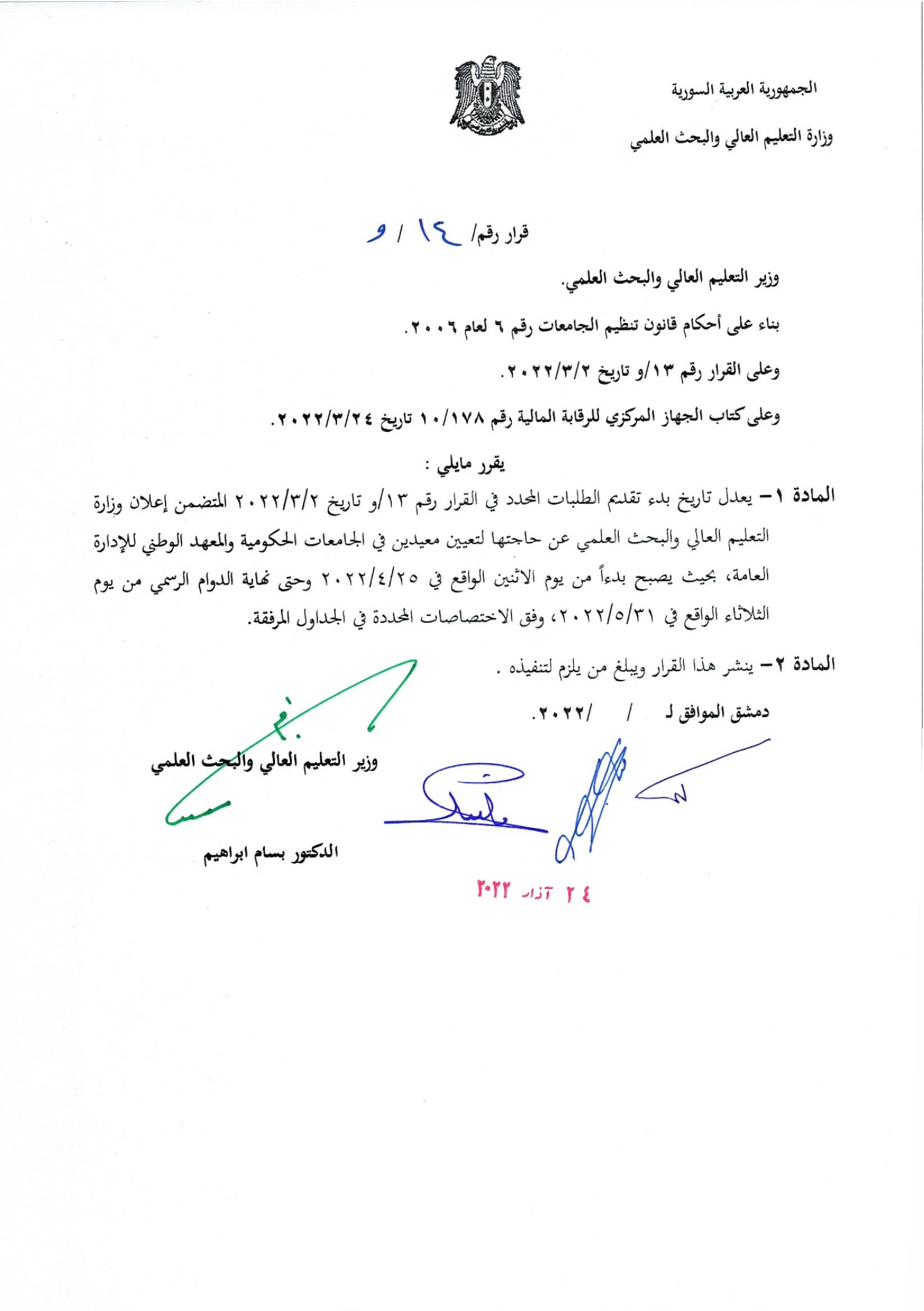 قرار وزارة التعليم العالي والبحث العلمي المتضمن تعديل تاريخ بدء تقديم الطلبات لتعيين معيدين